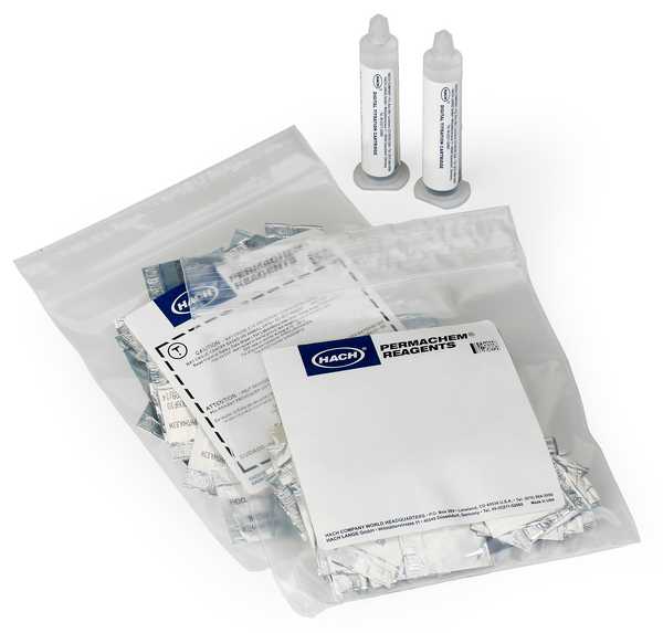 El juego contiene: sobres de reactivo en polvo con indicador de rojo de metilo y verde de bromocresol (94399), indicador de fenolftaleína (94299), cartucho de titulación de ácido sulfúrico de 1,600 N (1438901), cartucho de titulación de ácido sulfúrico de 0,1600 N (1438801)